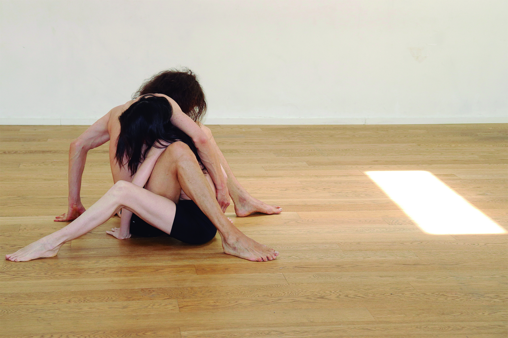2. The performers enter, sit facing each other, approach, and interlock.